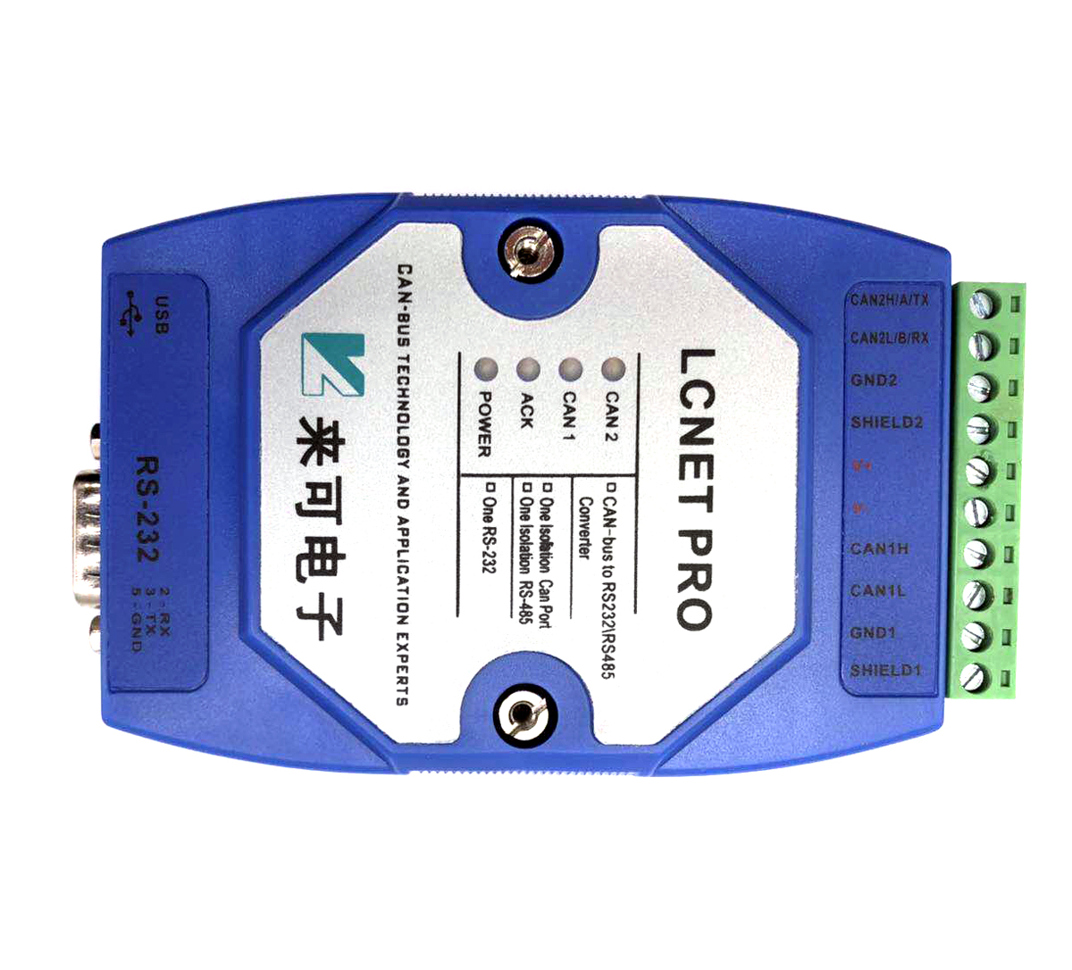 智能CAN/串口协议转换器LCNET ProRS-232/485提供一路RS-485、一路RS-232和一路CAN通道,实现CAN与串口之间数据双向智能转换。